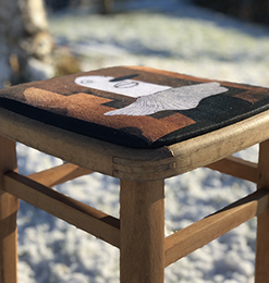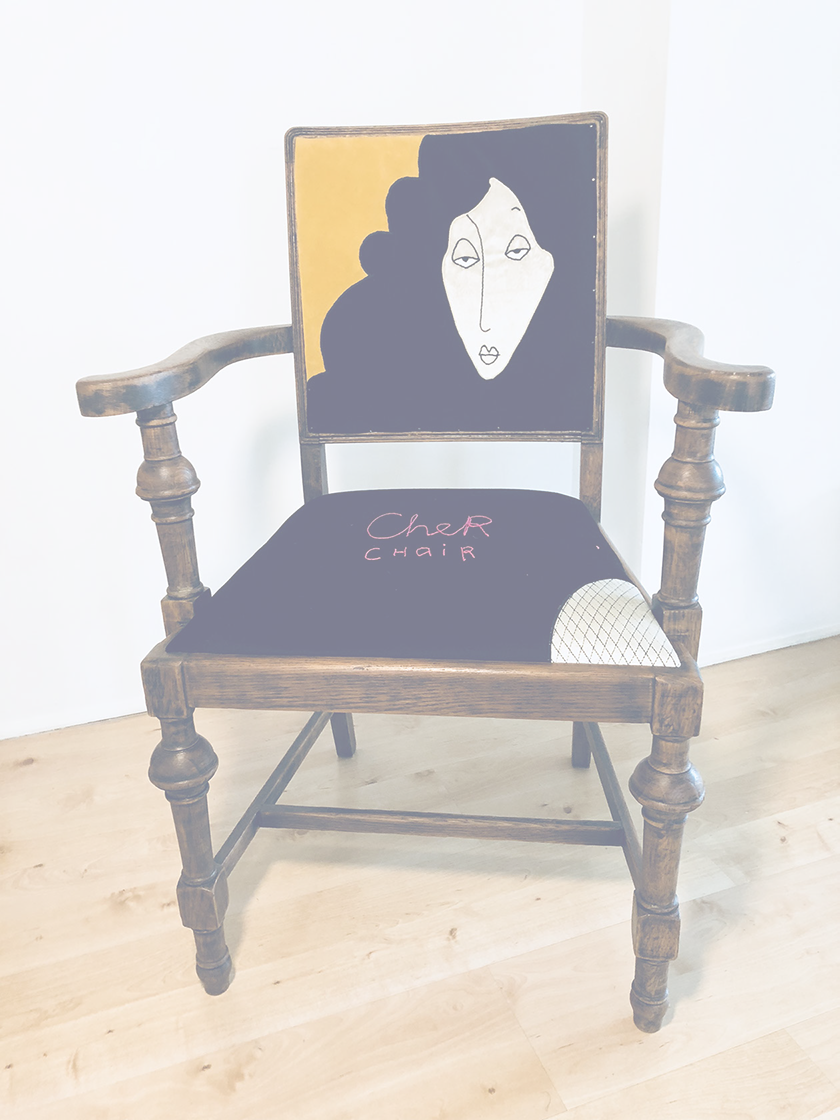 Sanded oak frame with a matte varnish. Grey velvet with embroidery floss in black and white.